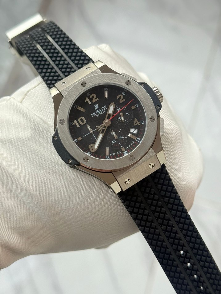 Hublot marka siyah kadranlı, gümüş detaylı ve dokulu siyah kayışlı klasik ve çağdaş tarzda erkek kol saati. ⌚