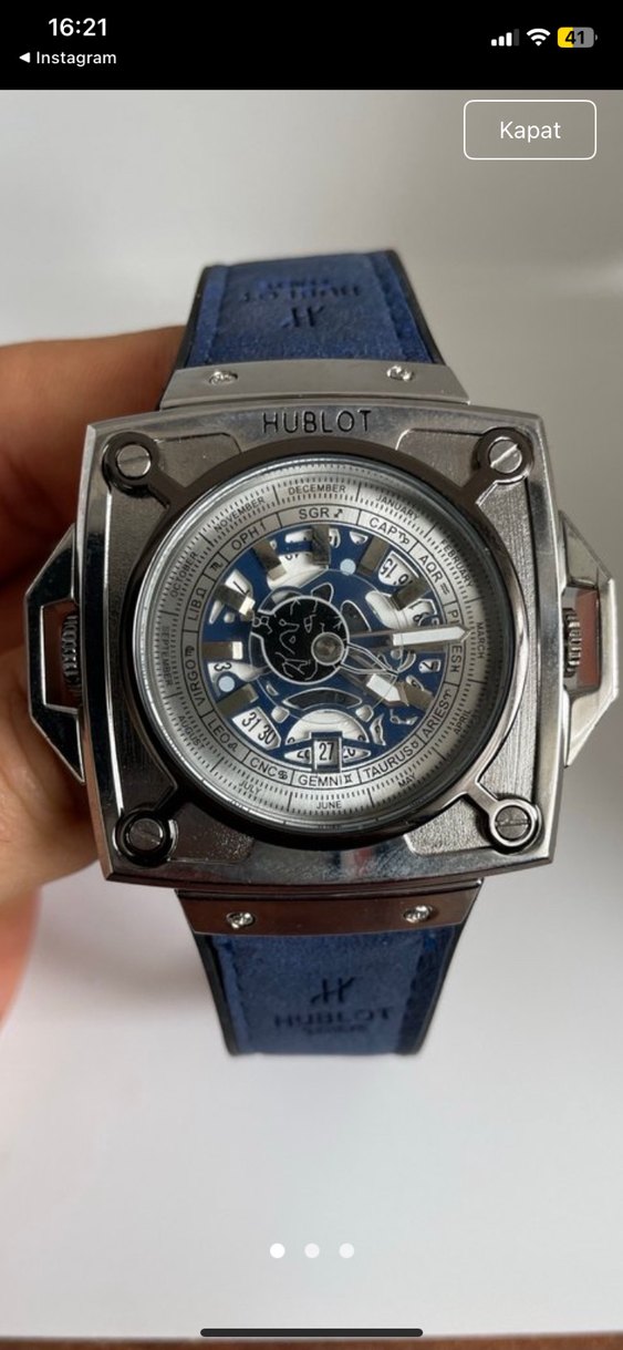 Hublot marka, kare metal kasa ve detaylı kadrana sahip mavi kayışlı erkek saati. Sokak stili ve karşı kültür tasarımını bir araya getirir. ⌚