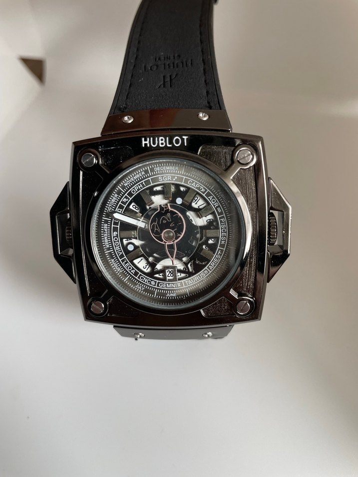 HUBLOT markalı siyah erkek saati, koyu renkli ve biker tarzında kare kasa ile detaylı kadrana sahiptir.
