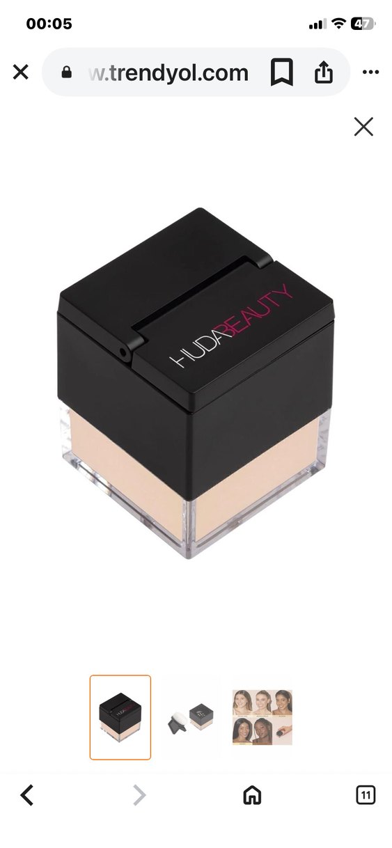 Huda Beauty markalı, açık bej renkte, siyah ve şeffaf kapaklı kompakt pudra. Resimdeki gibi ürün dolu en fazla 3-4kere kullanıldı.