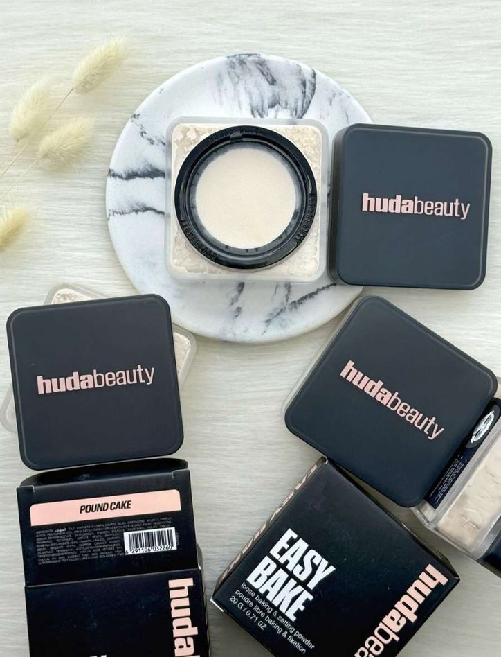 Huda Beauty Easy Bake bej renkte, mat bitişli, ince yapılı pudra. Siyah kapaklı kutusunda marka adı yer alır.
