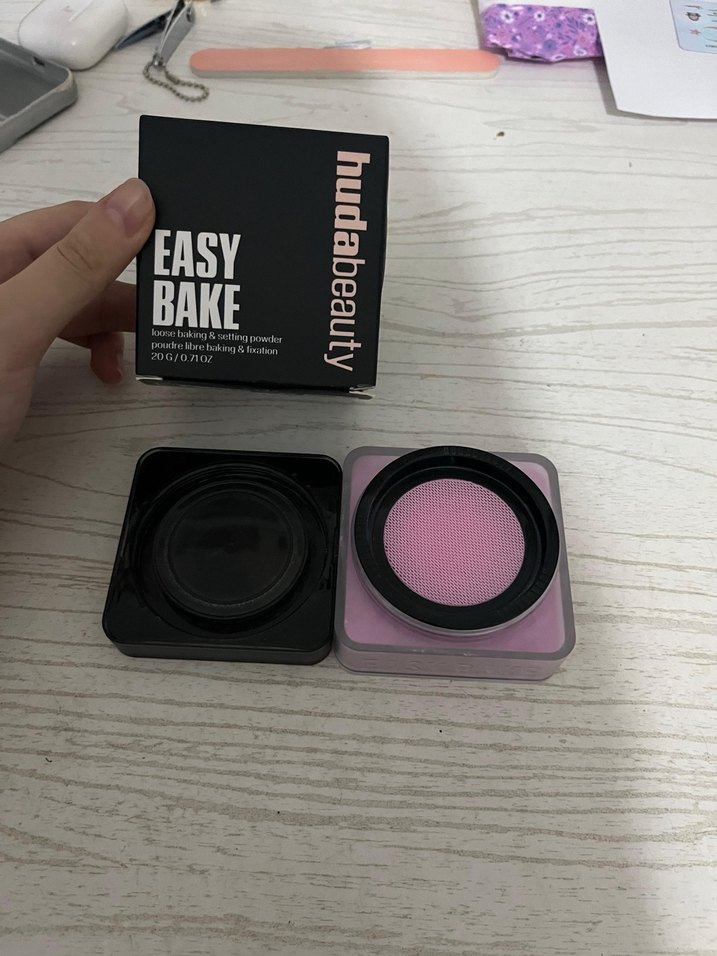 Huda Beauty Easy Bake pastel pembe renkli, makyaj sabitleme ve bake için kullanılan ince yapılı, hafif bir pudradır. Doğal bir görünüm sağlar. Sadece bir kez denedim rengi olmadığı için satıyorum
