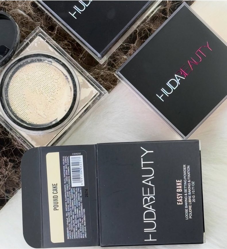 Huda Beauty Easy Bake Pound Cake tonu açık bej renkli, hafif yapılı, makyajı sabitleyen ince toz pudradır.