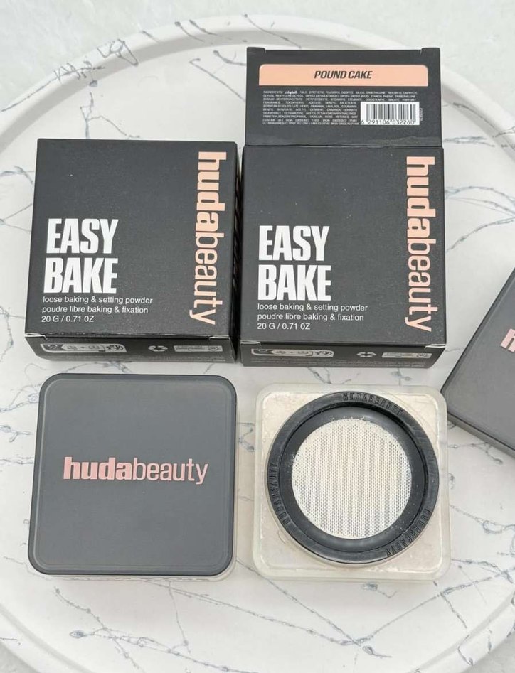 Huda Beauty Easy Bake koyu bej renkli gevşek pişirme ve sabitleme pudrası. Makyajın sabitlenmesine ve pürüzsüz bir görünüm sağlamaya yardımcı olur.