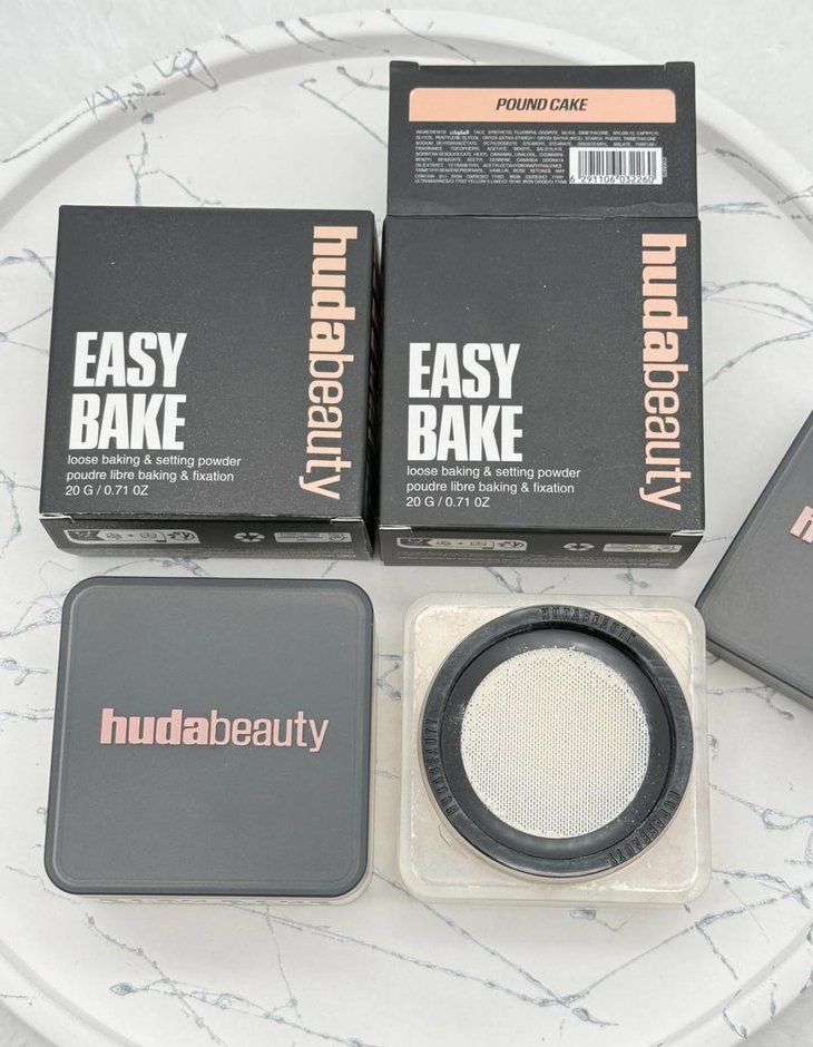 Huda Beauty Easy Bake, koyu bej renkte 20g gevşek pişirme ve sabitleme pudrasıdır. Uygulama için eleme aparatı içerir.