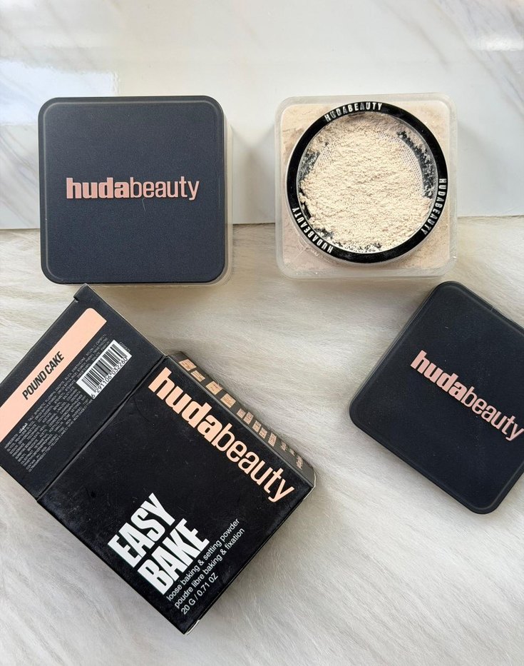 Huda Beauty Easy Bake bej tonunda, makyaj sabitlemek için kullanılan ince yapılı pudra. Şık siyah kutuda sunulur. ✨