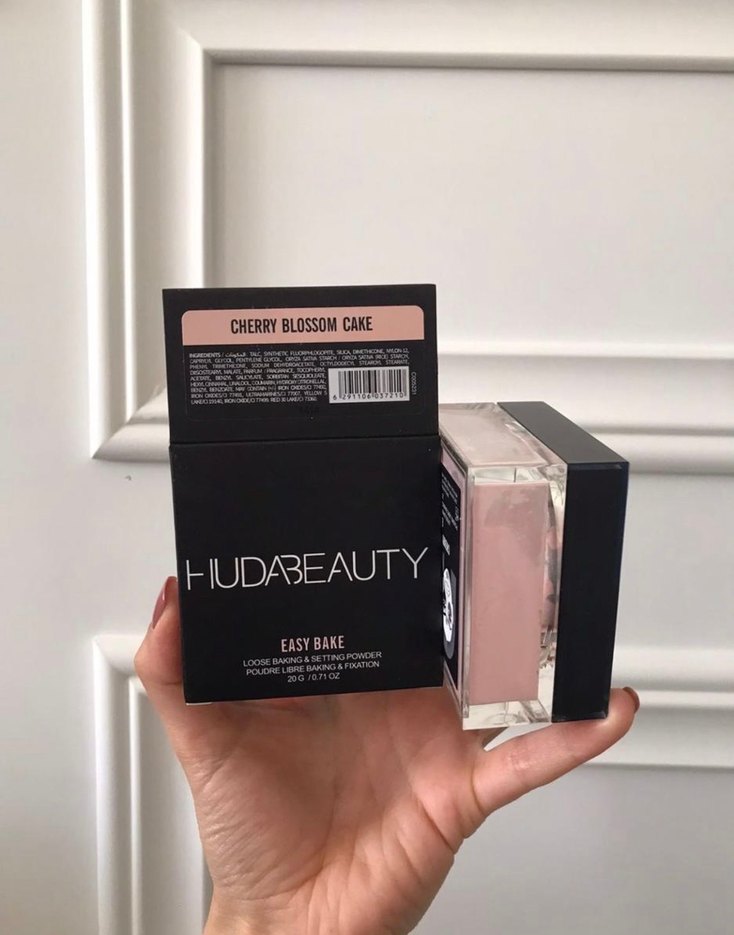 Huda Beauty Easy Bake gevşek pudra, pastel bej Cherry Blossom Cake rengiyle makyaj sabitlemek için pürüzsüz, mat bir görünüm sağlar.