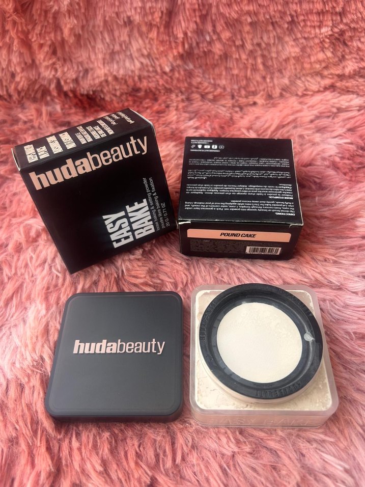 Huda Beauty Easy Bake koyu bej pudra, şık kompakt kutuda. Makyajı sabitlemek için pürüzsüz bir bitiş sağlar. Ürün sıfır ve etiketlidir.
