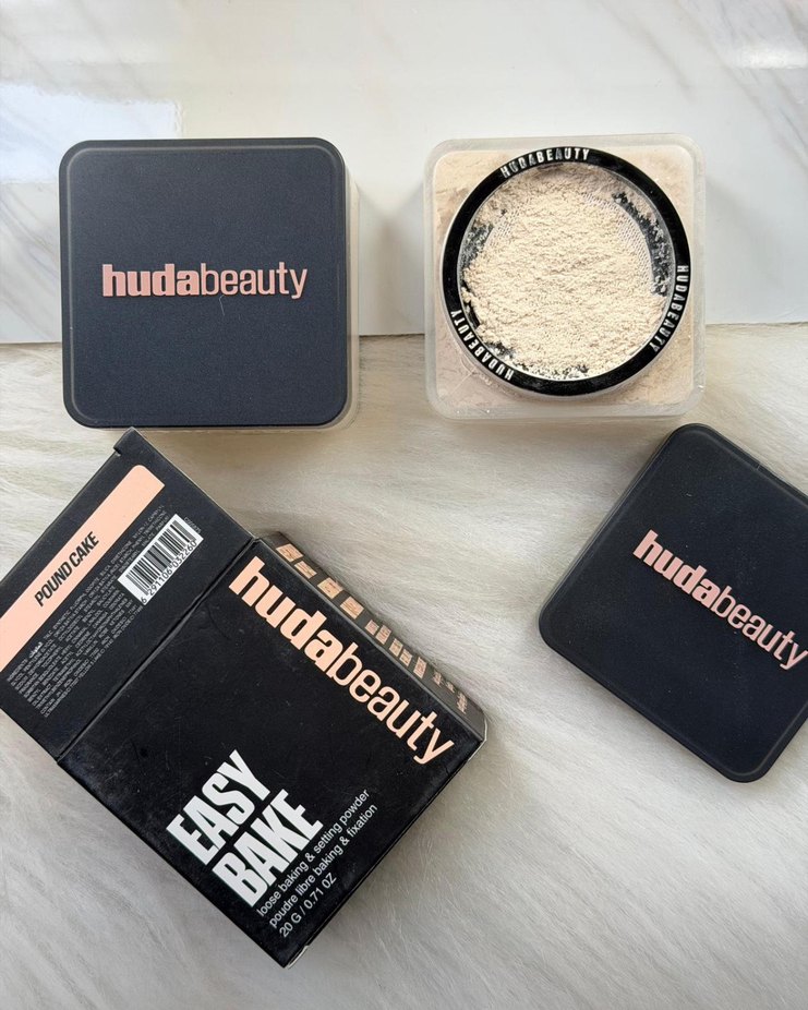 Huda Beauty Easy Bake pudra, Marka adı kapakta olan kompakt kutuda. Makyaj sabitlemek için kullanılır, pürüzsüz bitiş sağlar. ✨