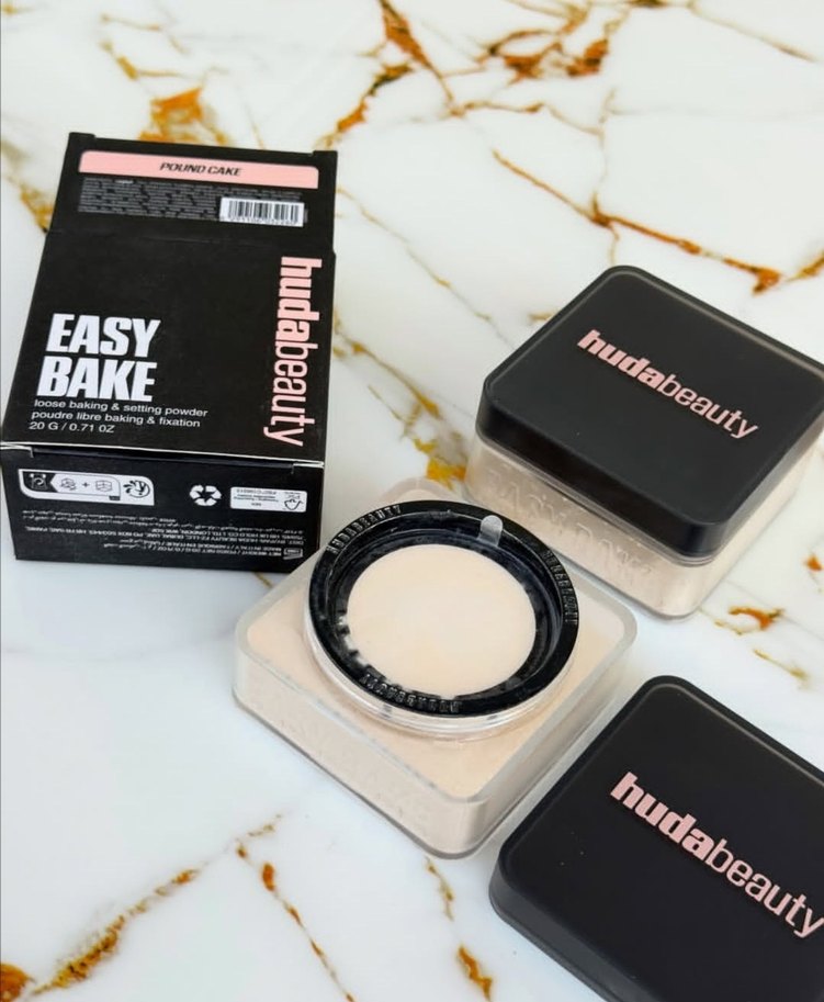 Huda Beauty Easy Bake, makyajı sabitlemek ve kalıcı hale getirmek için açık bej tonunda pürüzsüz yapıdaki bir pudradır.