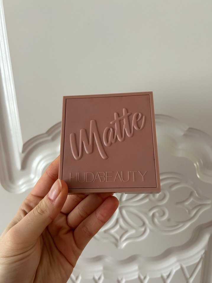Huda Beauty markasına ait pastel tonlu, mat bitişli bej renkli kompakt pudra. Kullanımı kolay ve elde rahat tutulur.