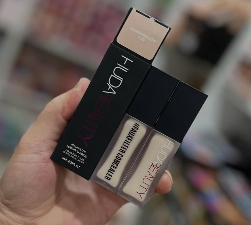 Huda Beauty #FauxFilter kapatıcı, açık bej tonunda, pürüzsüz ve mat bir bitiş sunar. Siyah ve şeffaf şişede şık tasarım. ✨