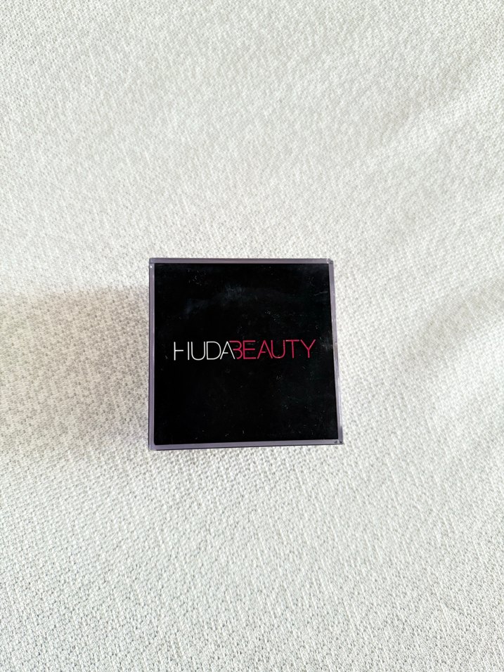Huda Beauty markalı makyaj pudrası, renkli kutusunda, makyajı sabitlemek için uygundur.