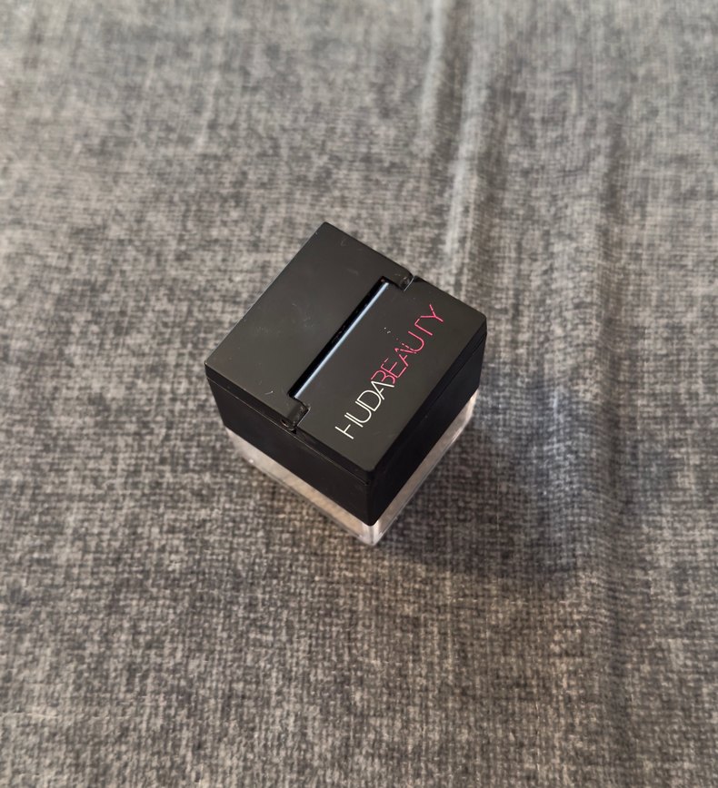 Huda Beauty markasına ait koyu siyah renkte pudra, makyajı sabitlemek için uygundur.
