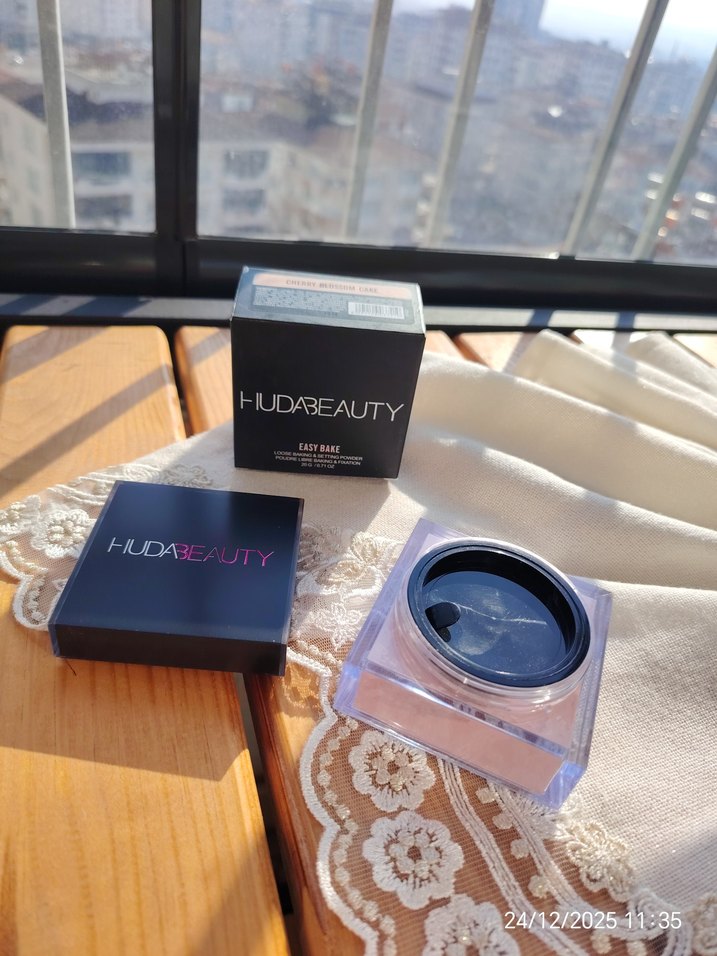 Huda Beauty markalı siyah pudra, koruyucu iç kapaklı şık bir kutuda sunulmaktadır. Makyaj sabitlemek için uygundur.