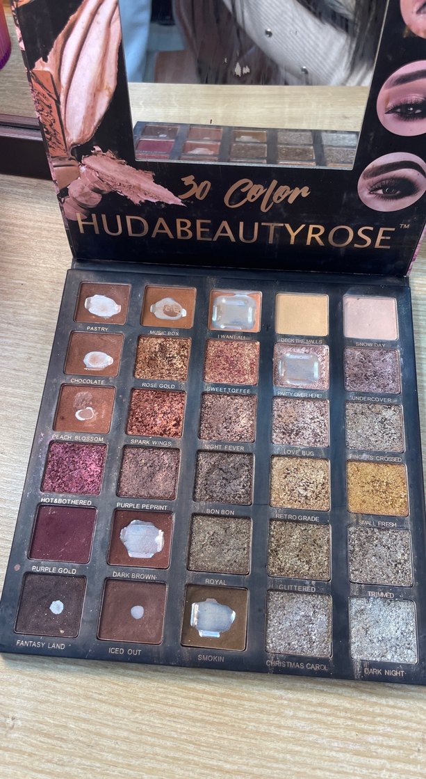 HUDA BEAUTYROSE 30 renk göz farı paleti, mat ve simli bitişlerle koyu kahverengi ve canlı tonlar içerir. Çeşitli göz makyajları için uygundur.