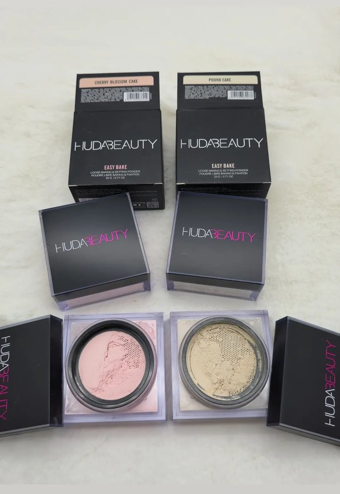 HUDABEAUTY markasına ait Cherry Blossom Cake ve Pound Cake tonlarında açık bej pudralar, pürüzsüz bir görünüm sağlar. ✨