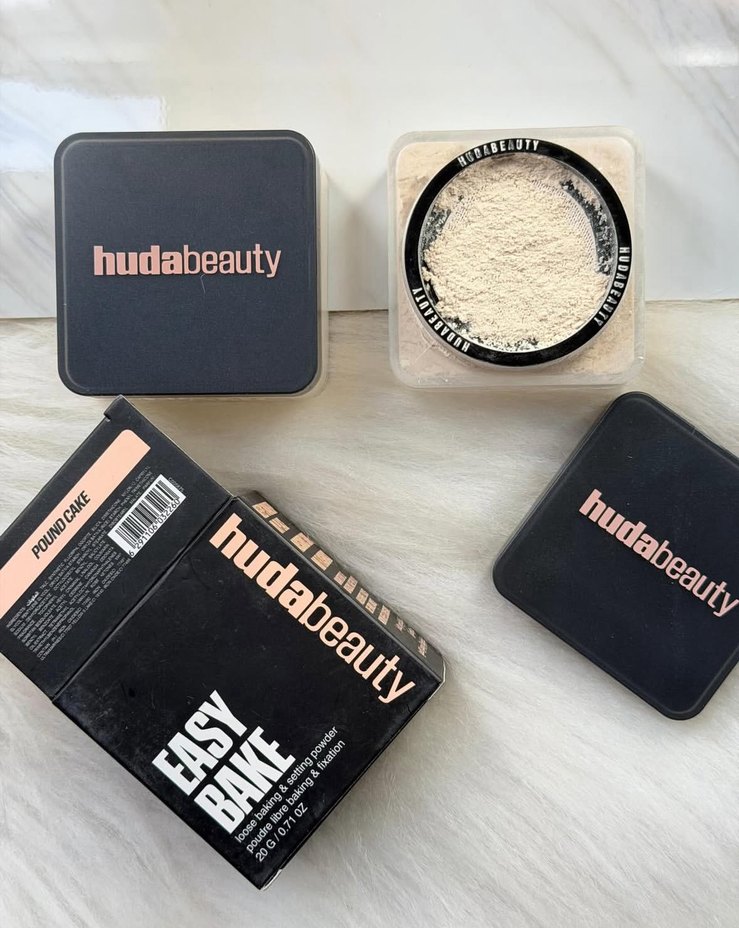 Hudabeauty Easy Bake koyu bej tonunda, makyaj sabitlemek için kullanılan ince pudra. Siyah kutuda rose gold logo ile sunulur.
