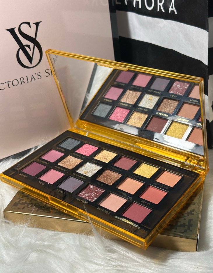 göz farı paleti, altın renkli kutusunda canlı koyu tonlar ve mat ile ışıltılı dokular sunar.