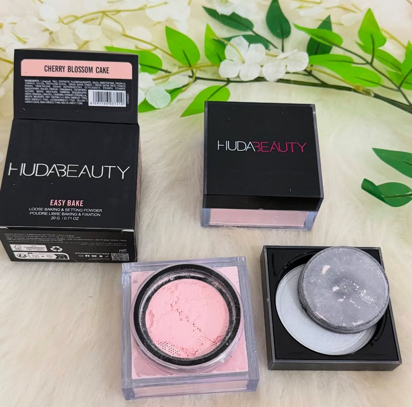 HudaBeauty markasına ait, hafif pembe tonunda, makyaj sabitleme ve baking için uygun, pürüzsüz dokulu ayar pudrası.
