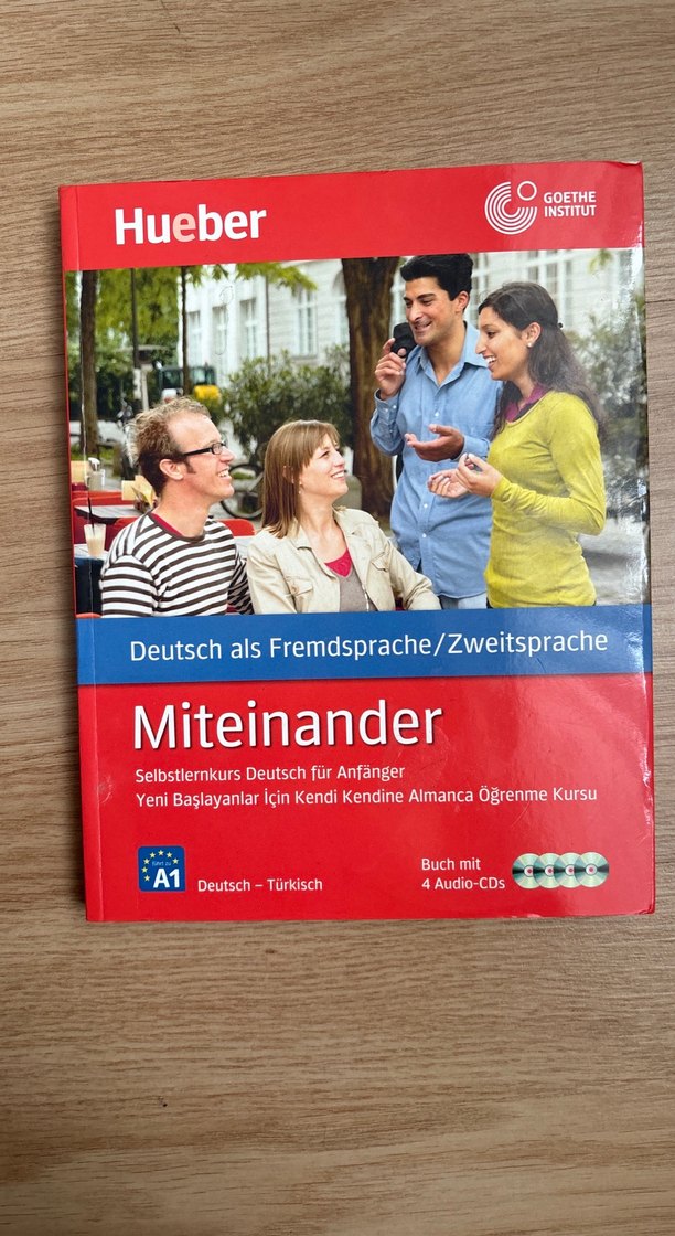 25 ünitenin ilk 6 ünitesi sadece kurşun kalemle doldurulmuştur ve sadece numara yazma gibi şeyler, silinebilicek şekildedir. Sıfırı 950-1000 lira arası. Miteinander, yeni başlayanlar için Almanca kendi kendine öğrenme setidir. Kitap ve 4 adet ses CD'si içerir. Almanca-Türkçe dil desteği sunar.