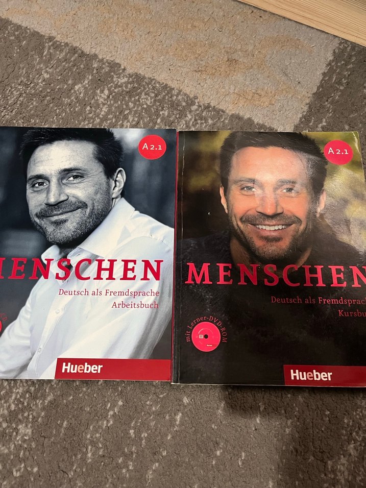 Hueber markasına ait A2.1 seviyesinde Almanca öğrenimi için Arbeitsbuch ve Kursbuch olmak üzere iki kitap seti. Arbeitsbuch sıfırdır hiç kullanılmadı. Kursbuch yaklaşık 37 sayfa kullanılmıştır geri kalan boştur.