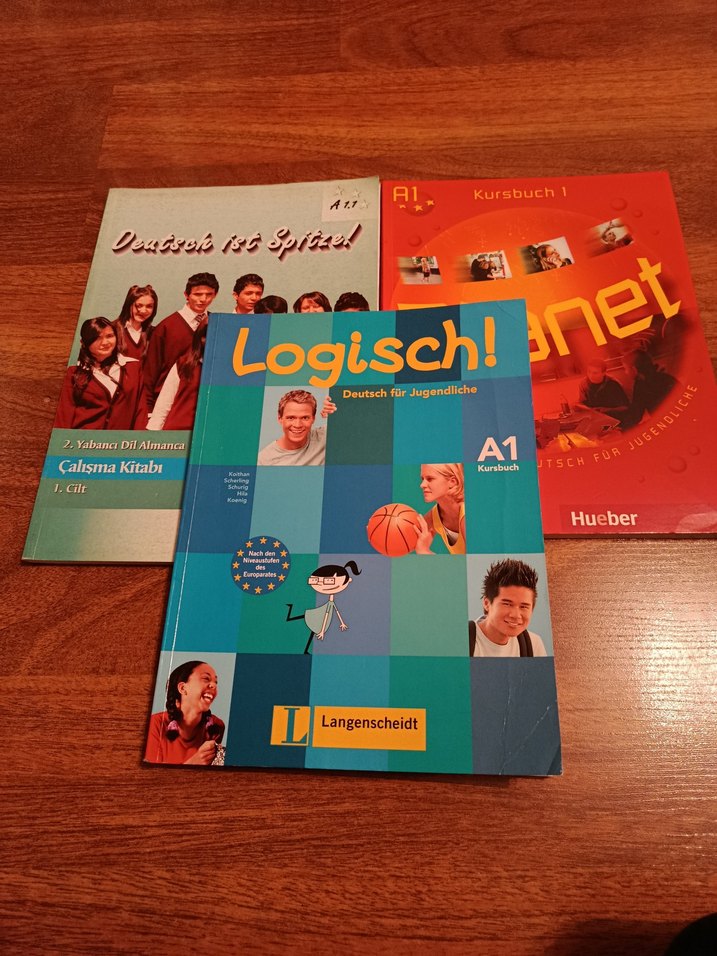 Başlangıç seviyesine uygun Hueber ve Langenscheidt Almanca çalışma kitapları, sadece 1-2 sayfa kurşun kalem ile kullanılmış