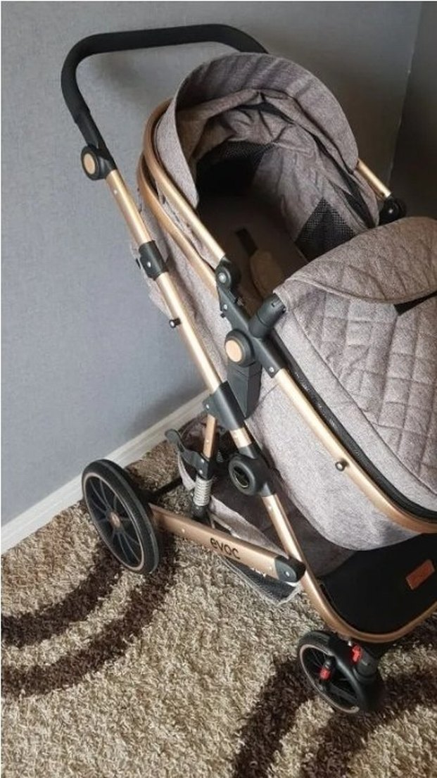 Kahverengi renkli bebek arabası, kapitone kumaş oturma alanı ve büyük arka tekerleklerle sağlam bir iskelete sahiptir. Konforlu ve pratik kullanım sunar. Travel sistem ve çok kullanılmadı ikinci Bebek arabası olduğu için duruyor hediye gelmişti. Kutusu faturası duruyor garantisi devam ediyor.