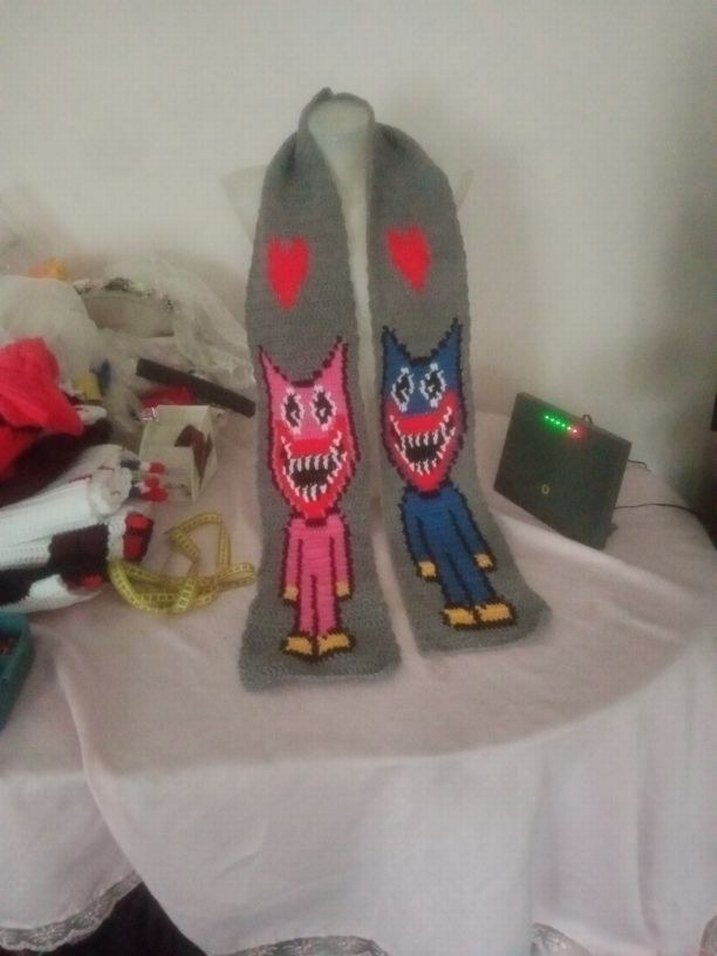 Boy 203 cm en 17 cm. Kendi tasarım ve el emegimdir. Gri triko taban üzerine, Poppy playtime oyunu karakterleri Huggy wuggy ve kissy missy karakterleri olan, başlarının üzerinde kalp ❤️ te olan, kalın kışlık atkı. Yeni ördüm. Gothic grunge y2k Punk emo rock emo vampire witchy dark Coquette bohem hippi tarzlara uygundur.