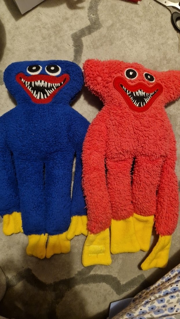 ikisi birlikte. Koyu mavi renkte, yumuşak kumaştan Huggy Wuggy peluş oyuncak, sarı elleri ve ayaklarıyla dikkat çeker. Yüzü büyük gözler ve keskin dişlere sahiptir.