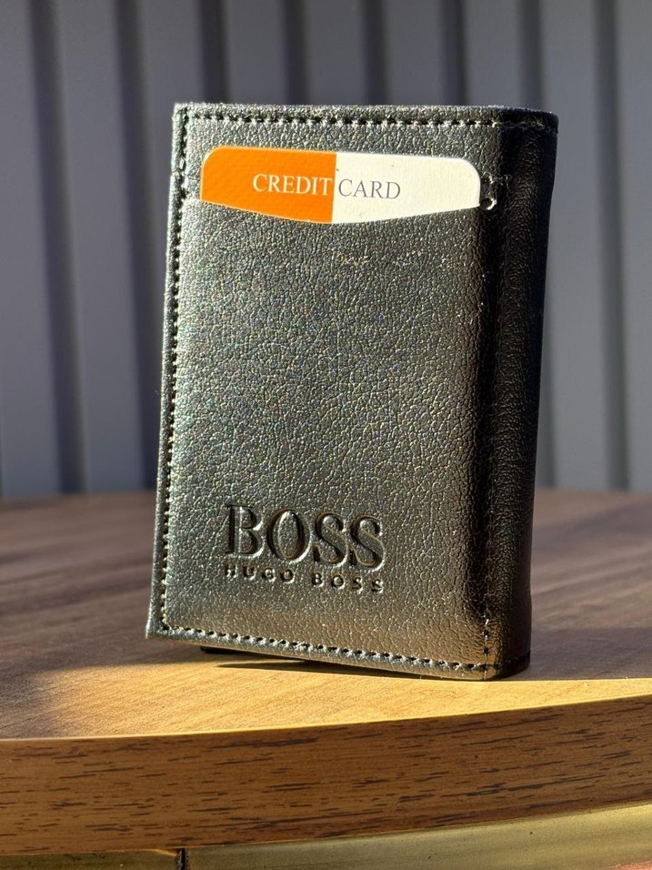 Hugo Boss erkek cüzdanı, baskılı gri ve kahverengi tasarıma sahip olup kredi kartı için bir yuva içerir. Sokak stili ile işlevselliği birleştirir.