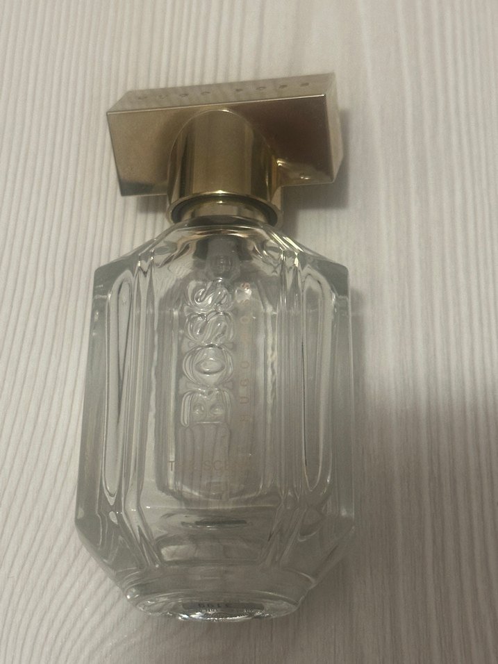 Altın kapaklı, şeffaf cam şişede Hugo Boss kadın parfümü. Zarif ve şık tasarım sunar. BOŞ Şişe koleksiyonerler için
