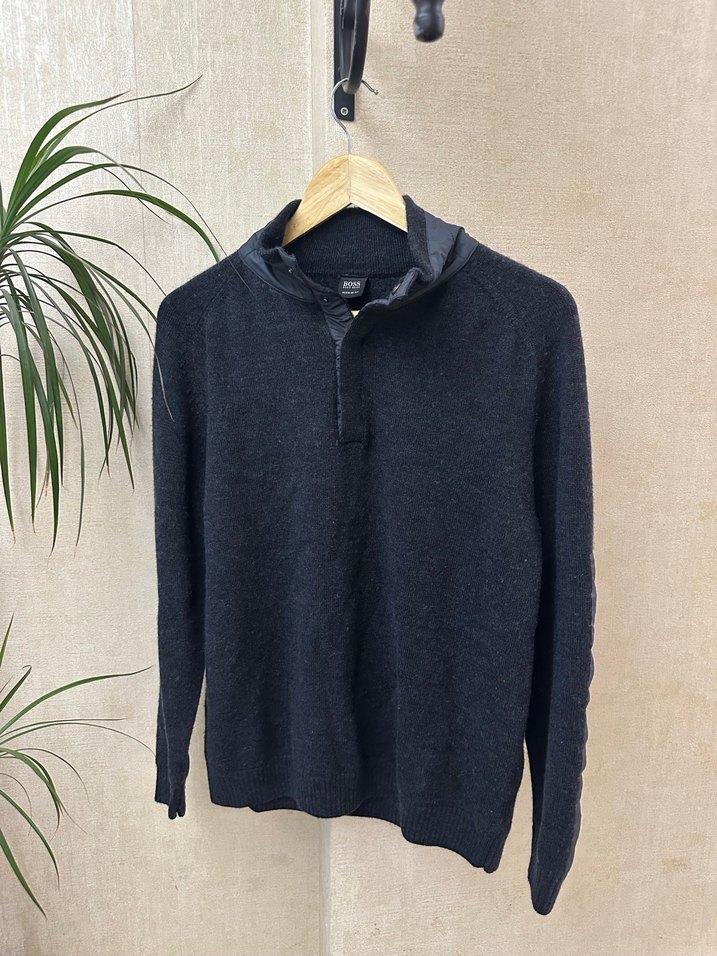 Gri renkte, yüksek yakalı ve uzun kollu örgü yün kazak. Rahat kesimi ve yarım fermuar detayıyla günlük sokak stili için uygundur.Xl beden %100 orjinal Hugo Boss marka yün kazak