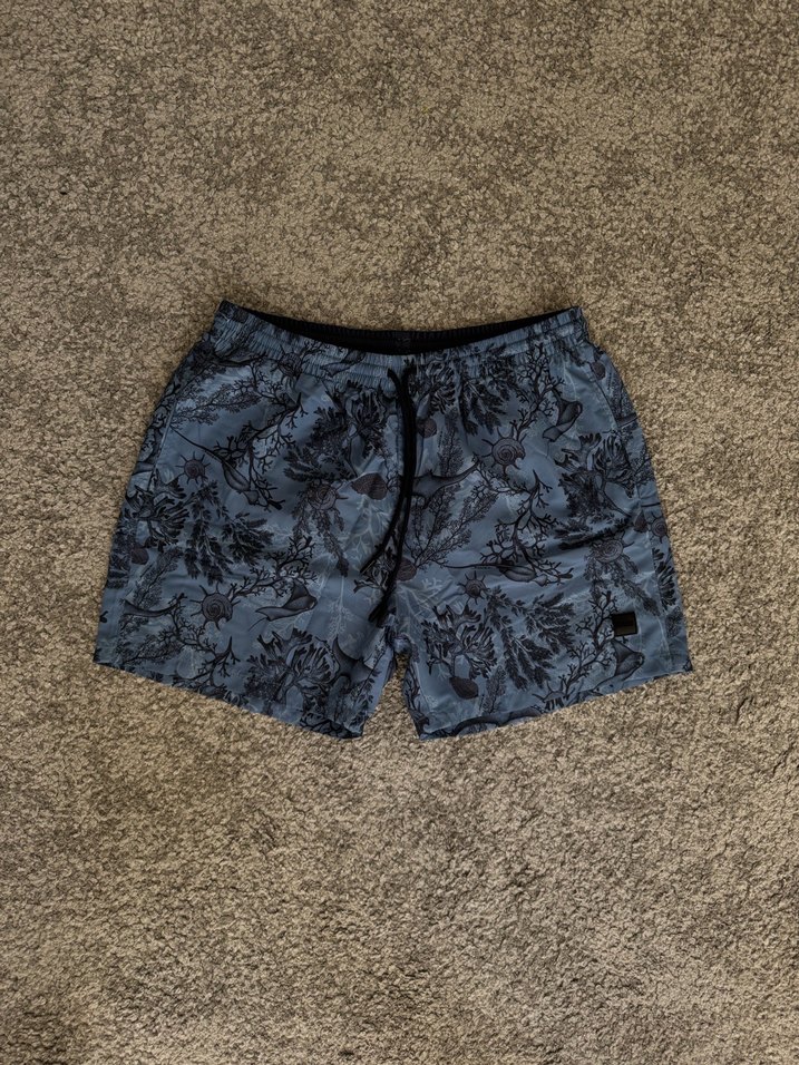 Gri renkli, bağcıklı bel ve çiçek desenli bol kesim erkek mini şort, açık hava etkinliklerine uygun.