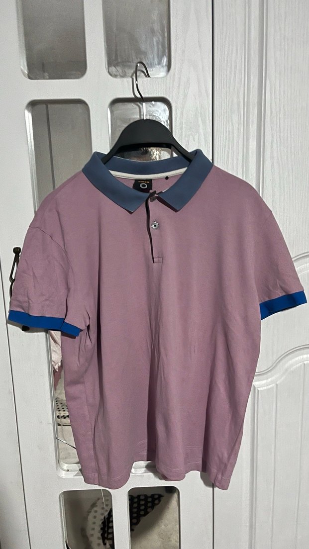 Bol kesim, kısa kollu düğmeli polo yaka tişört. Yumuşak sentetik kumaştan, pastel mor renkte ve mavi detaylarla. Günlük rahat sokak stili için uygun. Orijinal ürün