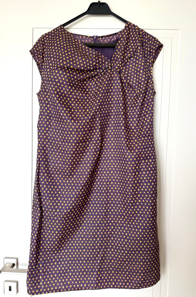 Yalnızca bir kere giyildi, yeniden farksız. İçi çıkarılabilir astarlı. Mürdüme dönül bir eflatun üzerine yavruağzı puantiye desenli. Uzunluk 91,5cm. Koltukaltı dikişten dikişe 47 cm. Bel sağdan sola 47 cm. Basen sağdan sola 53 cm.