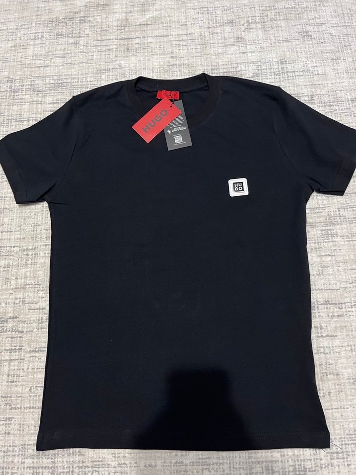 Siyah Hugo erkek tişörtü, kısa kollu, dbisiklet yaka. Göğüste küçük baskılı logo bulunmaktadır sıfır ürün ve A kalite üründür