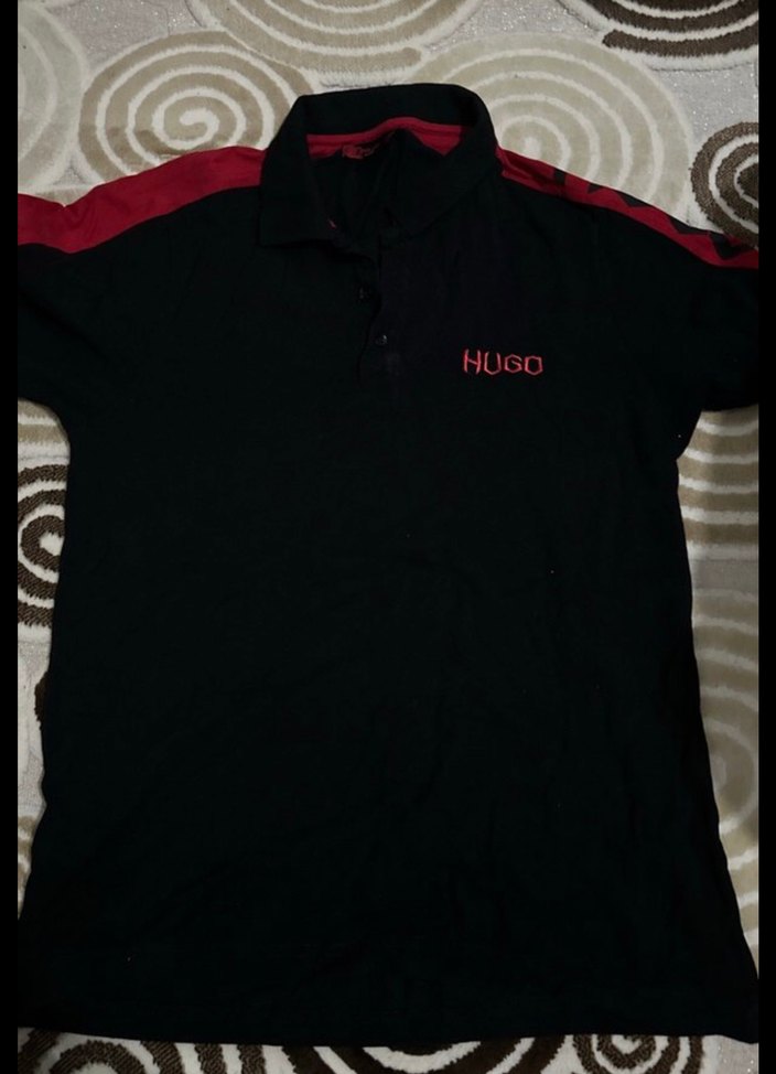 Koyu siyah, kırmızı omuz detaylı, düğmeli ve yakalı, HUGO baskılı, sentetik kumaştan, dar kesim kısa kollu polo tişört.