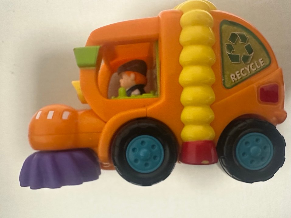 İtince kendi gidiyor ve öndeki mor parçalar dönüyor, geri dönüşüm kamyonu. Canlı renklerde oyuncak kamyon, kabin içinde sürücü figürü ve renkli tekerleklerle hayal gücünü destekler.