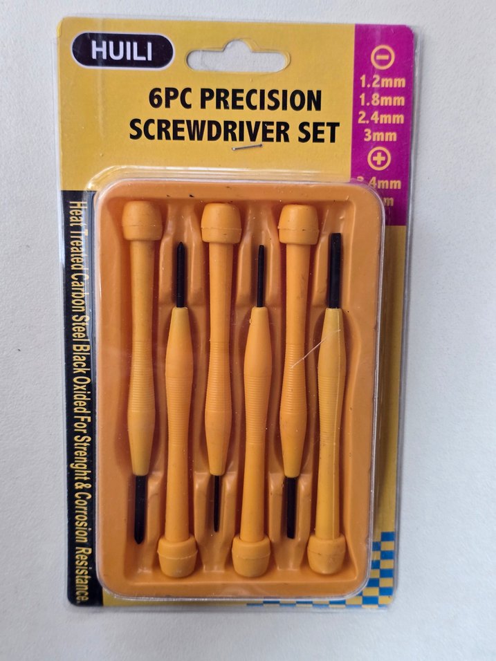 HUILI marka 6 parça hassas tornavida seti, 1.2mm, 1.8mm, 2.4mm ve 3mm boyutlarında, dayanıklı ve korozyona dirençli karbon çelikten üretilmiştir. Renkli bej saplara sahiptir. ️