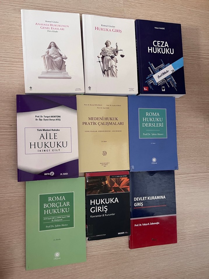 Anayasa hukuku, ceza hukuku, aile hukuku, borçlar hukuku, Roma hukuku ve devlet kuramı gibi dersleri içeren hukuk kitapları seti.