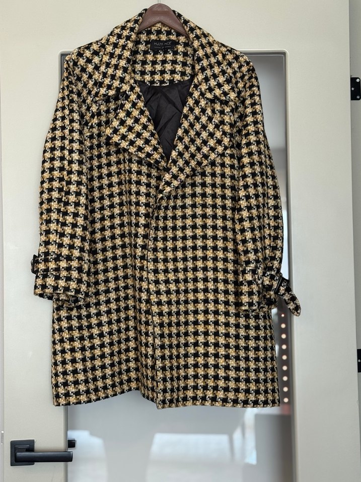 Hülya İnce Sarı-Siyah Kazayağı desenli Ekose Midi Kadın Kaban