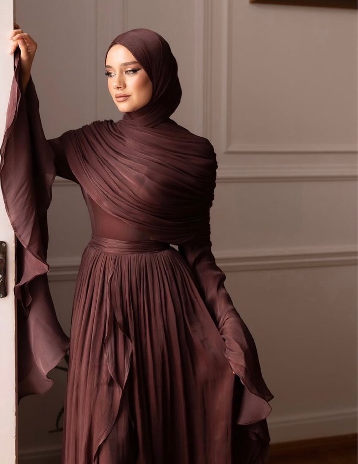 Drapeli, uzun kollu ve yüksek yakalı kahverengi tesettür abiye. Düğünler için şık, modern ve sade tasarım sunar Renkleri mevcut satılık 3000 sıfır .