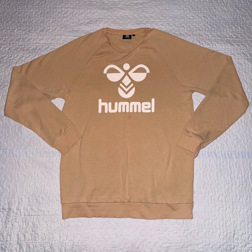 Bej renkli Hummel sweatshirt, uzun kollu ve yuvarlak yakalıdır. Yumuşak sentetik kumaştan yapılmış, bol kesim ve baskılı logoya sahiptir, gündelik şıklık için uygundur.