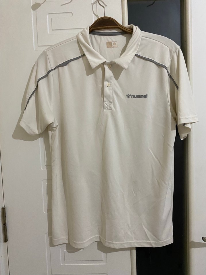 Hummel markalı beyaz erkek polo tişört, kısa kollu ve yakalıdır. Rahat kalıbı ve gri baskılı detaylarıyla günlük kullanıma uygundur.