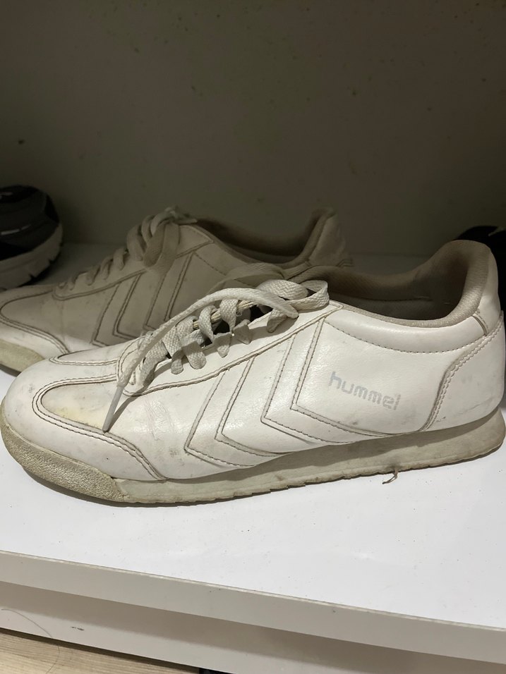 Hummel markalı beyaz kadın spor ayakkabısı, kalın topuklu ve desensiz tasarıma sahip. Kauçuk malzemeden üretilmiş, spor ve günlük kullanım için uygun. Rahat ve şık. 36numara