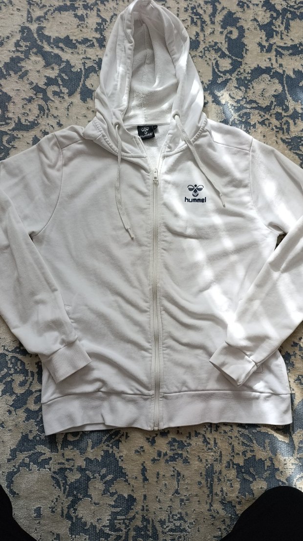 Hummel beyaz kapüşonlu fermuarlı erkek sweatshirt, uzun kollu ve dar kesimdir. Yumuşak fleece kumaştan üretilmiş, rahat ve günlük kullanım için uygundur. Baskılı logo detayına sahiptir. logosu silinmiştir beyaz olduğu için hafif leke mevcut ama yıkanınca çıkar