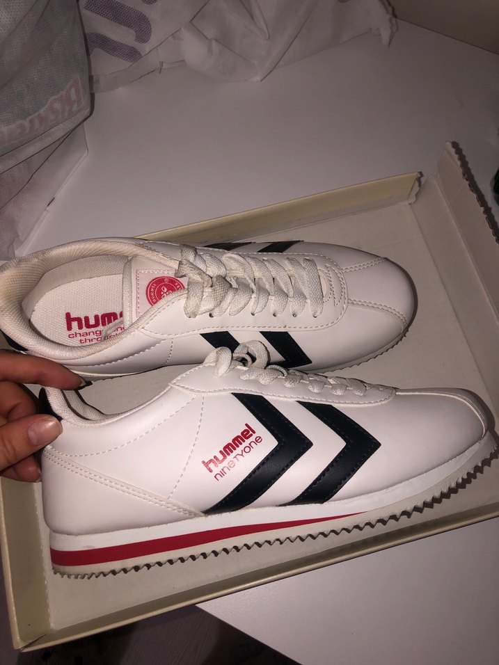 Hummel beyaz spor ayakkabı, baskılı detaylar ve cırt cırtlı, kauçuk tabanlı ve stilettolu topuklu. Trendy casual sokak stili ve spor için uygun.
