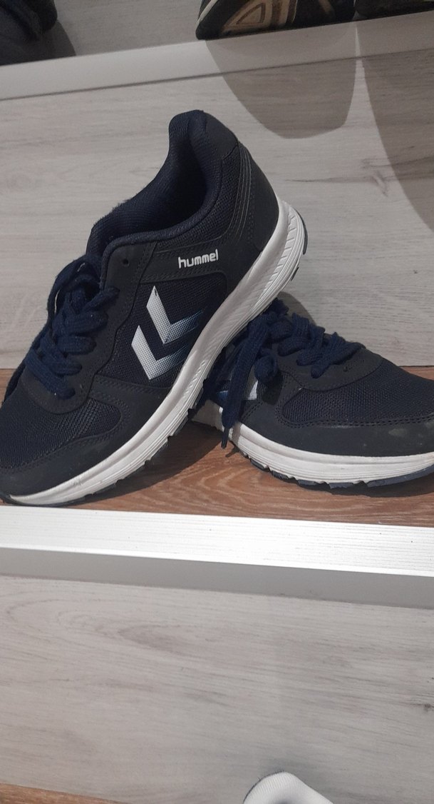 Hummel markalı, mavi renkli, baskılı desenli ve cırt cırtlı erkek sneaker. Kauçuk tabanlı, sokak stili için uygun.
