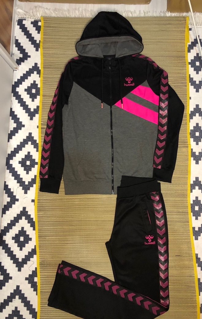 Kadınlar için kapüşonlu, uzun kollu ve fermuarlı eşofman takımı. Yumuşak fleece kumaştan, gri ve siyah renkte, pembe baskılı detaylara sahip, spor ve sokak stili için uygun. Ürün yalnızca 2 kez giyilmiştir. Sıfır ürün gibidir. Rahat bir takımdır.